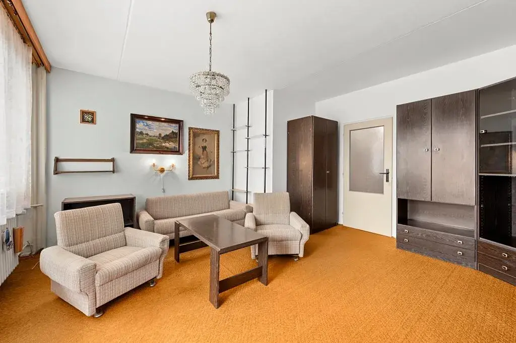 Disponuje velkou předsíní do tvaru písmene L, odkud je z její jedné části vstup do prostorného obývacího pokoje se vstupem na zasklený balkon, dále je zde vstup do pokoje využívaného jako ložnice, také do dalšího pokoje a to pracovny. Z druhé části předsíně je vstup do koupelny, WC a kuchyně.