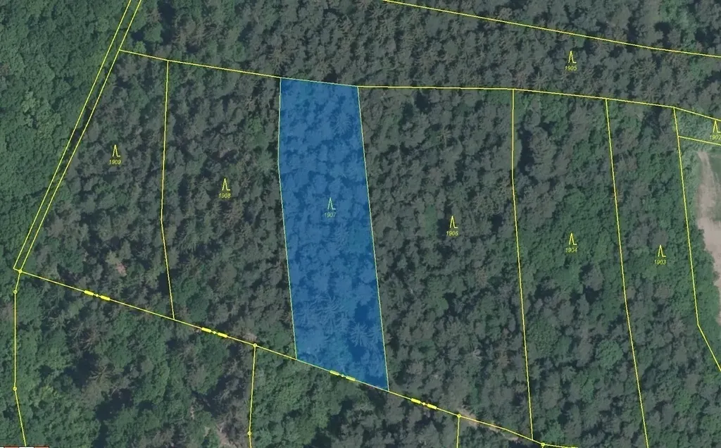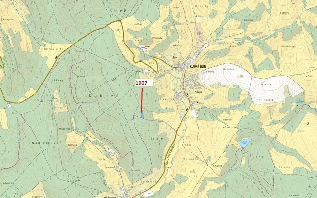 Lesní pozemek o výměře 3147 m2, parcelní číslo 1907, podíl 1/1, katastrální území Kladná Žilín, obec Luhačovice, obec s rozšířenou působností Luhačovice, okres Zlín, Zlínský kraj. Po těžbě.