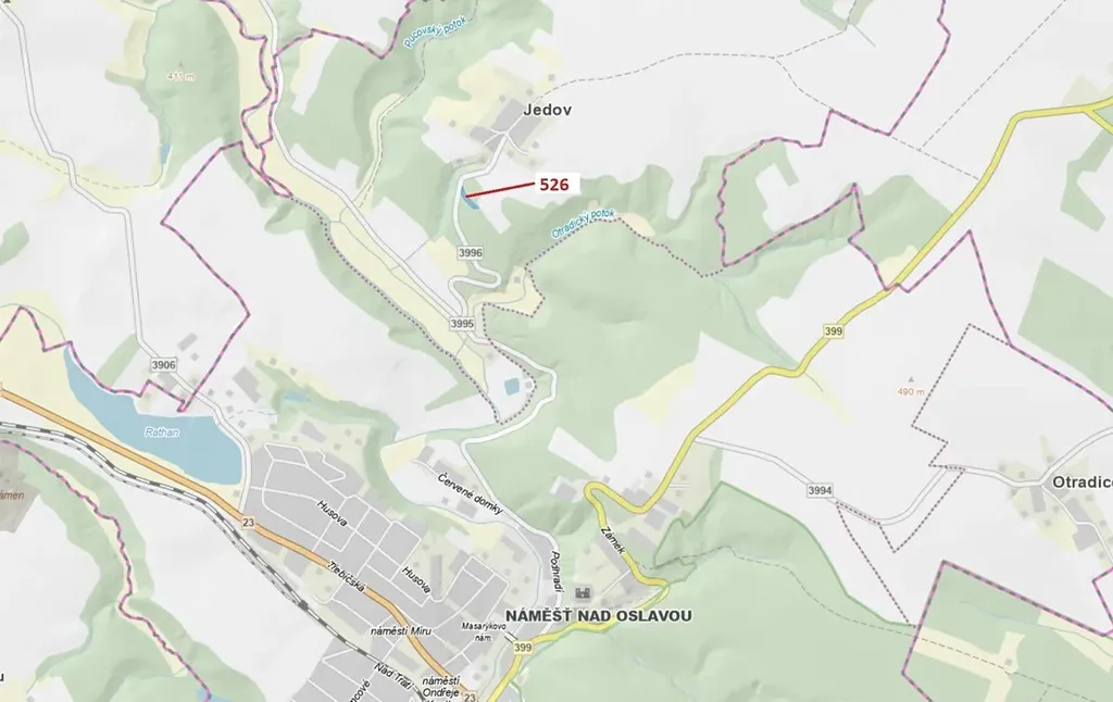 Lesní pozemek o výměře 1796 m2, parcelní číslo 526, podíl 1/1, katastrální území Jedov, obec Náměšť nad Oslavou, obec s rozšířenou působností Náměšť nad Oslavou, okres Třebíč, Kraj Vysočina. Částečně po těžbě.