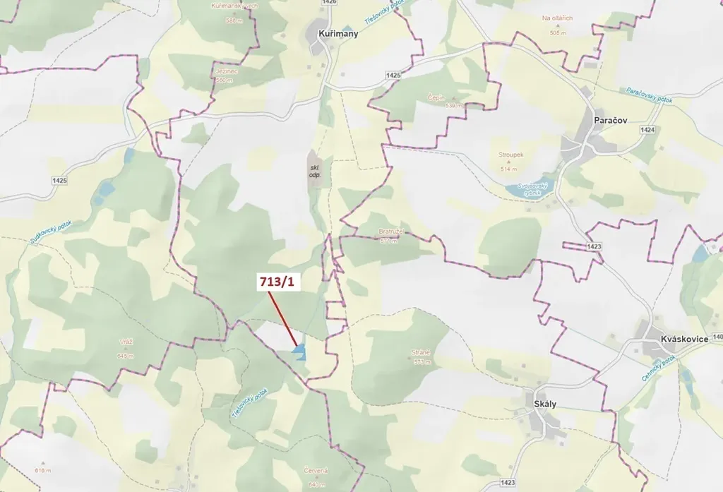 Lesní pozemek o výměře 5067 m2, parcelní číslo 713/1, podíl 1/1, katastrální území Kuřimany, obec Kuřimany, obec s rozšířenou působností Strakonice, okres Strakonice, Jihočeský kraj. Po těžbě.