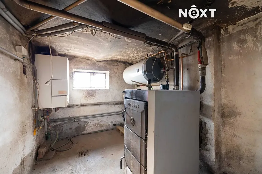 Vytápění domu zajišťuje kotel na tuhá paliva umístěný v samostatné kotelně ve sklepě, kde se nachází i garáž přístupná ze dvora.
