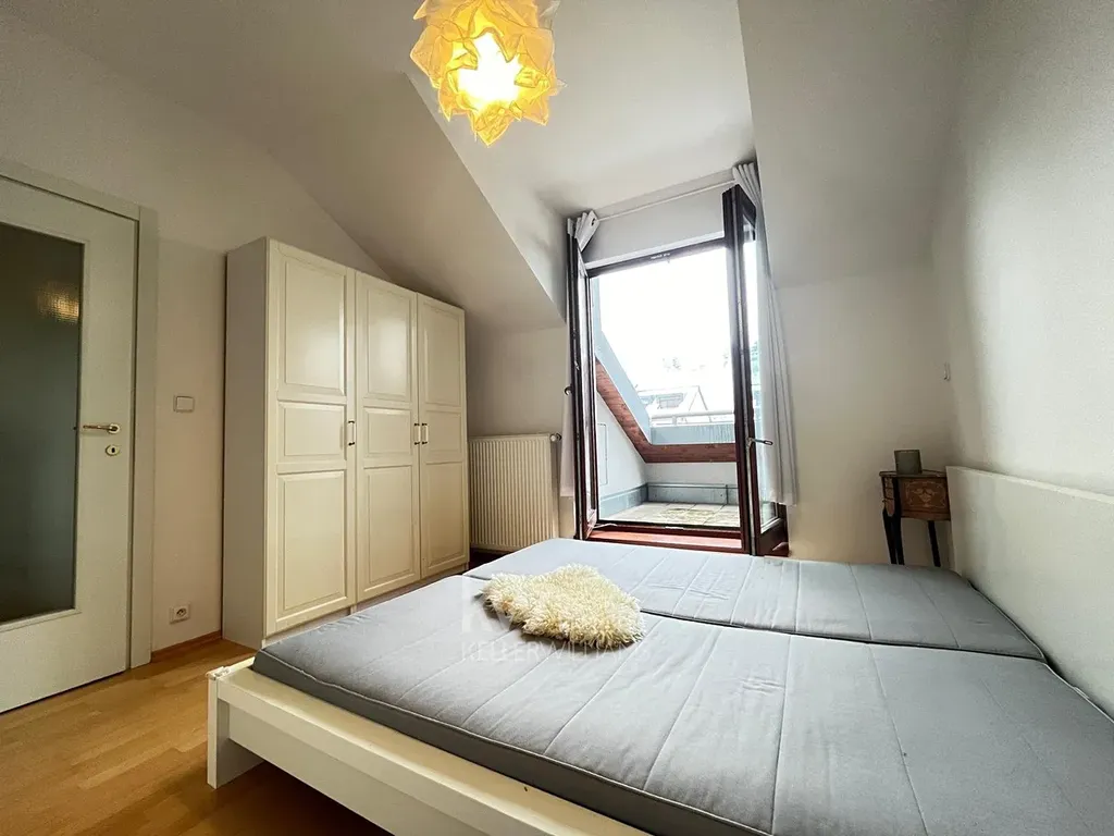 Tento světlý byt 2+kk je situován v moderním bytovém domě, který se může pochlubit dokonale udržovanými společnými prostory a bezpečnostním systémem. Při vstupu do bytu vás uvítá prostorný obývací pokoj s kompletně vybaveným kuchyňským koutem - varnou deskou, vestavnou myčkou, vestavnou troubou, vestavnou lednicí s mrazákem a nádobím. Z obývacího pokoje je přímý přístup velkými francouzskými okny na 2 balkony, který slouží jako dokonalé místo pro relaxaci po dlouhém dni. V obývacím pokoji je skříňka s TV, rozkládací sofa a moderní jídelní stůl se 4 židlemi, dekorační komoda z antikvariátu.