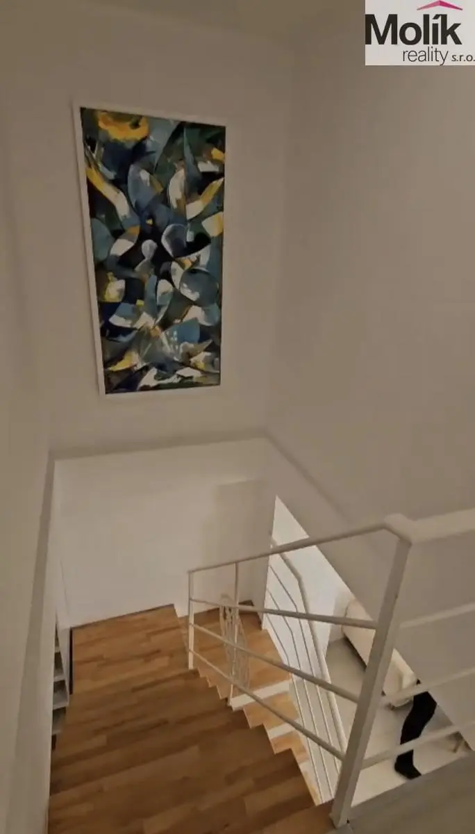 Designové schodiště s dřevěnými stupni vede do horního patra, kde se nachází dvě komfortní ložnice. Hlavní ložnice nabízí panoramatický výhled na moře, který vás bude probouzet každé ráno, a působí jako soukromý hotelový suite. Druhá ložnice je ideální pro hosty, děti nebo jako pracovna. Byt disponuje jednou moderní koupelnou v čistém, nadčasovém stylu.
