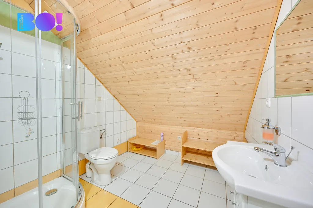 1. patro: druhá koupelna se sprchovým koutem, dva prostorné pokoje, úložné prostory