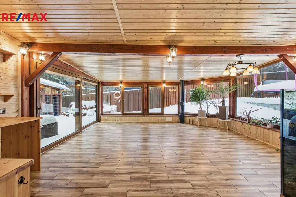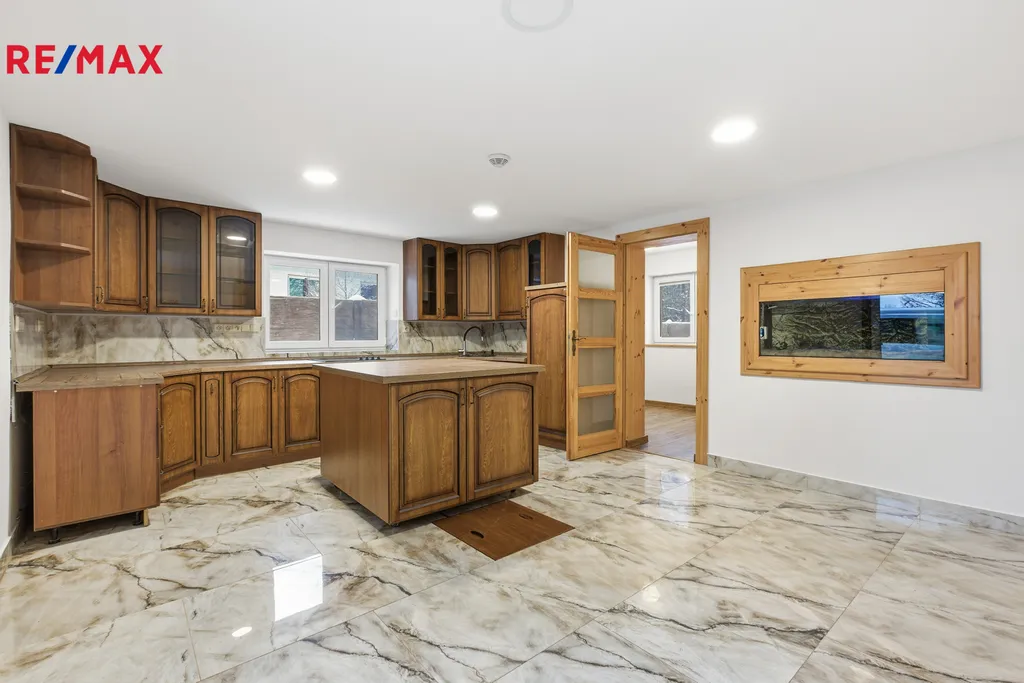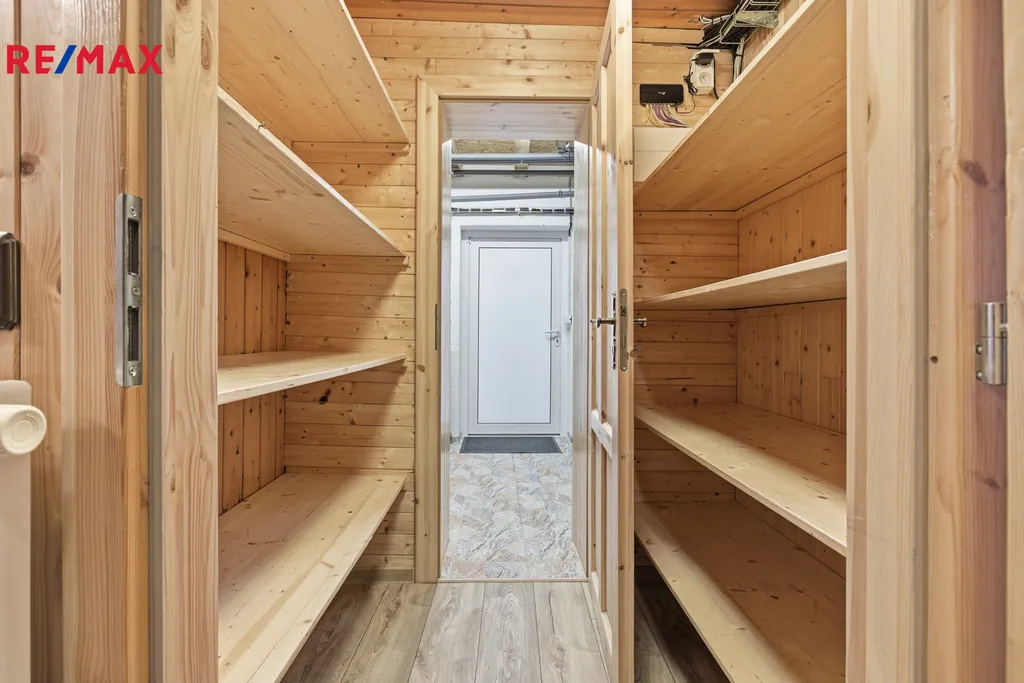 Interiér domu je laděn do přírodního stylu, kde hlavní roli hraje dřevo – na podlahách, stropech i vestavěném nábytku. V prvním patře se nachází pracovna, moderní koupelna s WC, technické zázemí, garáž a otevřený obytný prostor propojující kuchyň, jídelnu a obývací část. Součástí patra je také dětská herna. Kuchyň je řešena velmi prakticky a originálně – pod posuvným kuchyňským ostrůvkem se nachází sklep o velikosti cca 6 m² s aktivním odvětráváním. Kuchyňská linka je vyrobena na míru a nabízí bohaté úložné prostory. Celý obytný prostor dotvářejí rustikální prvky, krbová kamna a výrazné akvárium umístěné pod televizí, které dodává interiéru jedinečný charakter.