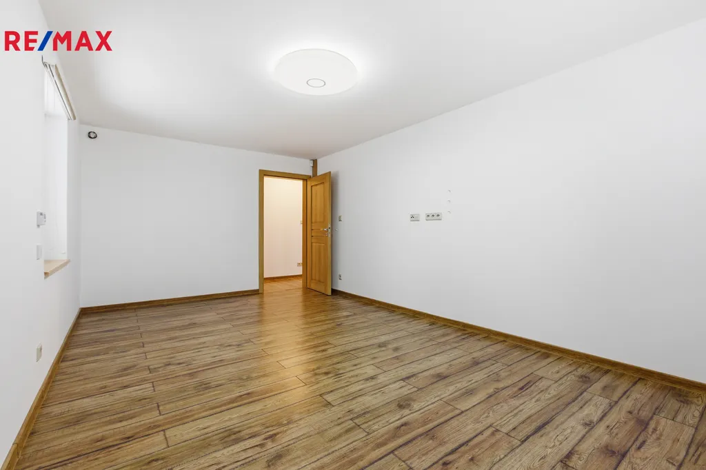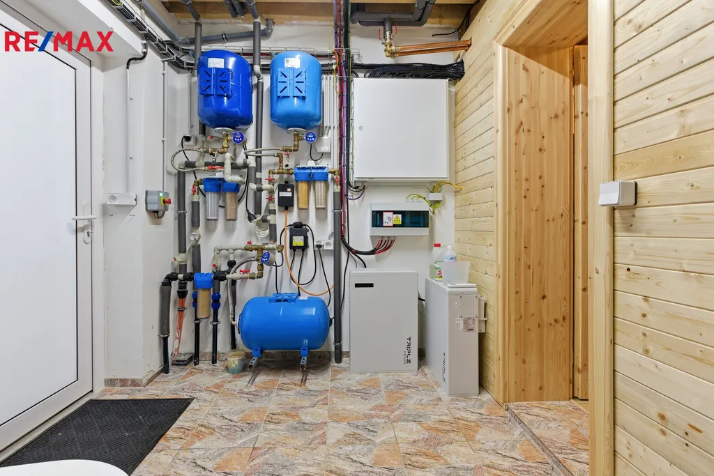 Ve druhém patře jsou umístěny ložnice a další koupelna s WC. Masivní schodiště a precizně zpracované detaily vytvářejí útulnou, ale zároveň reprezentativní atmosféru. Nad garáží se nachází prostorná půda o velikosti cca 40 m² a další půdní prostor nad domem o rozloze přibližně 80 m², do kterého je již přivedeno topení – ideální možnost pro vybudování dalších obytných místností. Dům je vybaven moderními technologiemi – kamerovým systémem kolem celého objektu napojeným na bezpečnostní službu Jablotron, videotelefonem s možností vzdáleného přístupu a elektronickými venkovními roletami, které zajišťují stínění, vyšší bezpečnost i lepší tepelnou izolaci. Tyto prvky zároveň přispívají ke snížení energetické náročnosti domu. Vytápění domu je řešeno podlahovým topením napojeným na tepelné čerpadlo. Na střeše jsou instalovány solární panely o výkonu 34 kW. Odpad je řešen vlastní čističkou odpadních vod. Zásobování vodou je zajištěno třemi zdroji: vrtanou studnou na pozemku (využívanou k zalévání), studnou před domem pro splachování WC a podzemní nádrží o objemu 12 m³ na pitnou vodu.