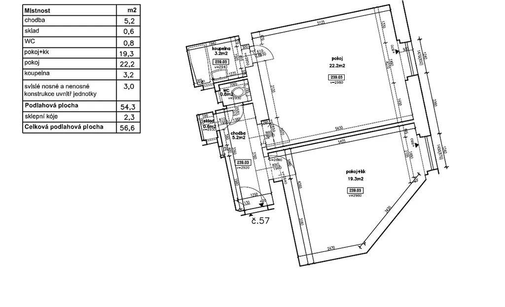 Byt má velmi příjemnou dispozici, kdy oba obytné pokoje jsou přístupné z centrální předsíně při které se nachází samostatná toaleta(0.8 m2) a komora(0.6 m2). Byt je světlý, ložnice(22.2 m2) i obývací pokoj(19,3 m2) jsou orientované na východ. Koupelna(3,2 m2) se sprchovým koutem se vstupem z ložnice. Ohřev vody bojlerem. Topení elektrické.
