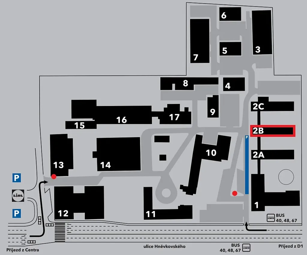 - přímo před areálem je zastávka autobusů MHD č. 40, 48, 63, 67, dojezd za 10 minut z hlavního nádraží, 8 minut od Vaňkovky a 5 minut ze Zvonařky,