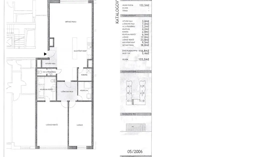 Dispozice bytu nabízí prostorný obývací pokoj s plně vybavenou kuchyní, toaletu pro hosty a otevřenou vstupní halu. Dále je zde hlavní ložnice s en-suite koupelnou (vana se sprchovou zástěnou, toaleta), druhá ložnice, samostatná koupelna se sprchovým koutem, technická místnost, úložná komora a chodba s vestavěnými skříněmi.