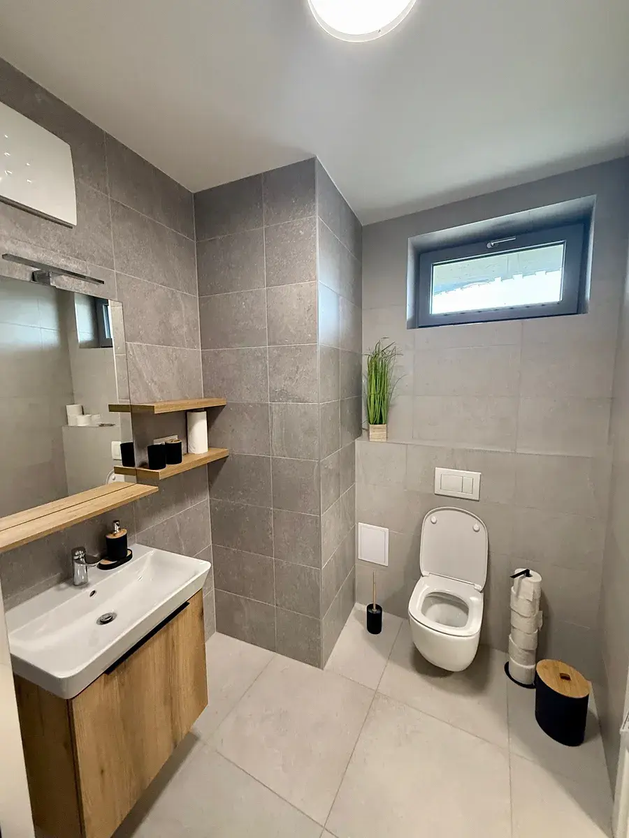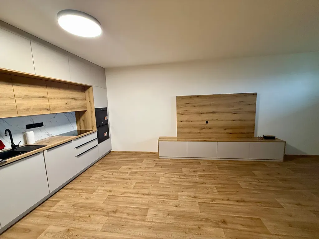 Interiér je navržen v nadčasových přírodních tónech, které působí harmonicky a útulně. Obytnou část zdobí vinylová podlaha v dekoru dubu, koupelna v elegantních šedých odstínech s betonovým designem působí moderně a čistě. Sprchový kout s bezpečnostním sklem, závěsné WC Geberit a kvalitní sanita podtrhují celkový dojem promyšleného a funkčního bydlení. Součástí bytu je také moderní kuchyňská linka vybavená kvalitními spotřebiči a vestavěný nábytek. Okna jsou osazeny venkovními elektrickými žaluziemi. Bezpečnostní vstupní dveře v antracitu a dřevěné interiérové dveře dotvářejí stylový celek.