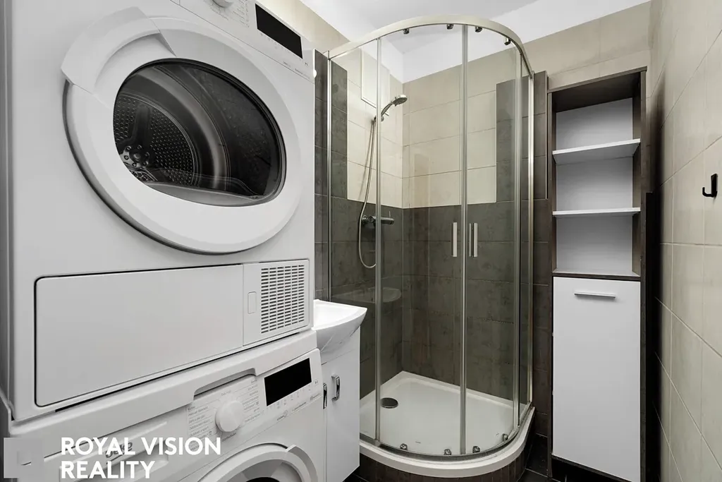 Koupelna byla rovněž rekonstruována v roce 2022 a je vybavena sprchovým koutem. WC je samostatné. Velkou výhodou bytu je praktická komora, kterou lze využít jako technickou místnost, spíž nebo sklad, což výrazně zvyšuje komfort bydlení. Součástí bytu je také lodžie orientovaná na jih a sklepní kóje o velikosti 1,38 m², která je po rekonstrukci.