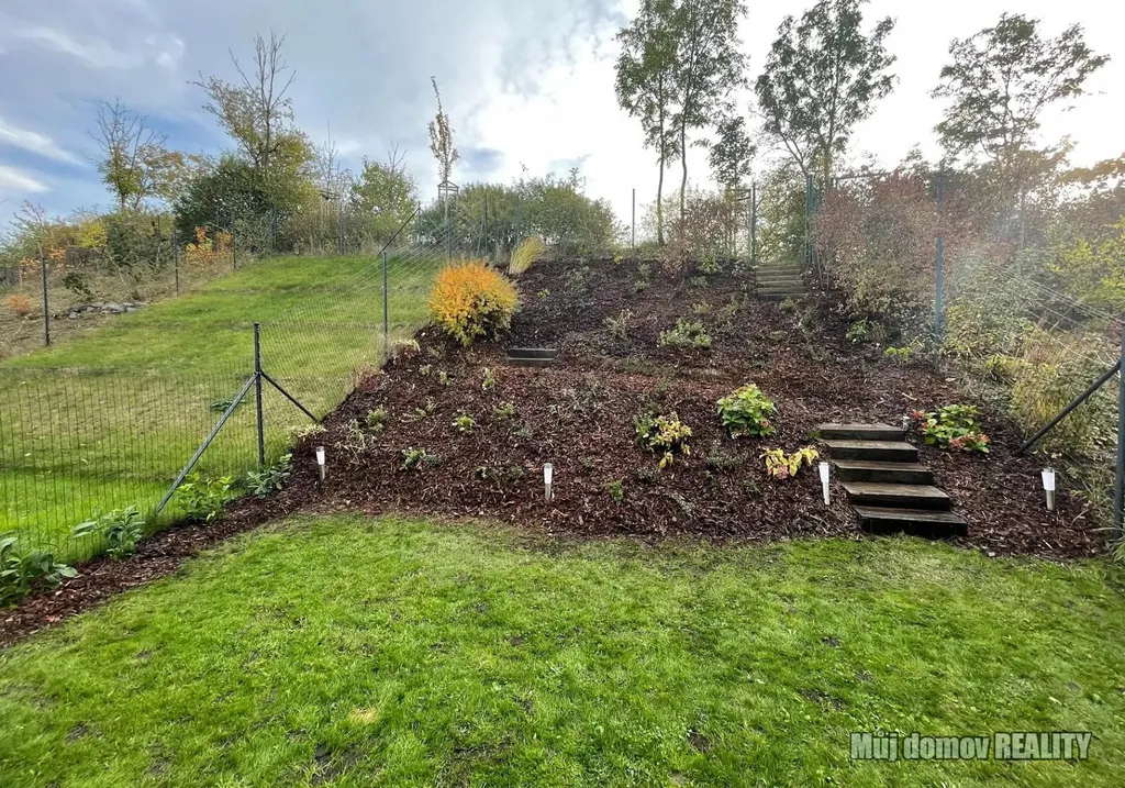 Součástí domu je soukromá zahrada o velikosti 97 m, terasa, balkon, uzavíratelná garáž, další garážové stání a prostorný sklep. Celková plocha pozemku činí 200 m.