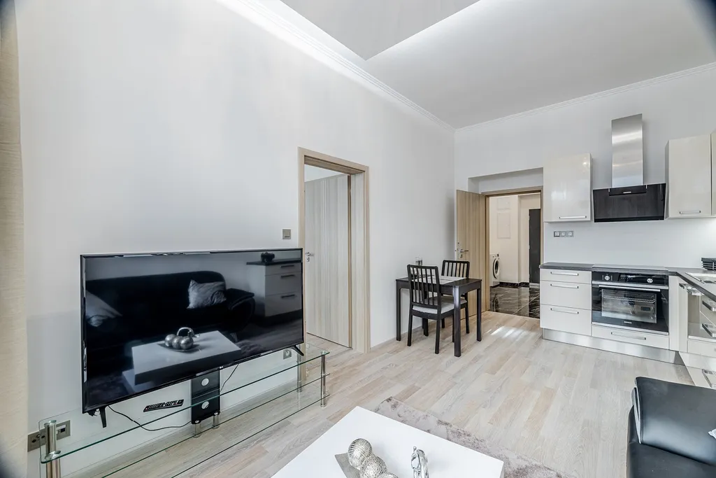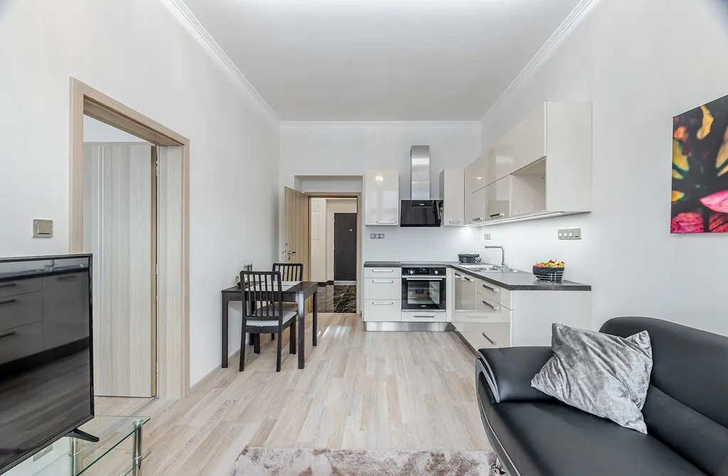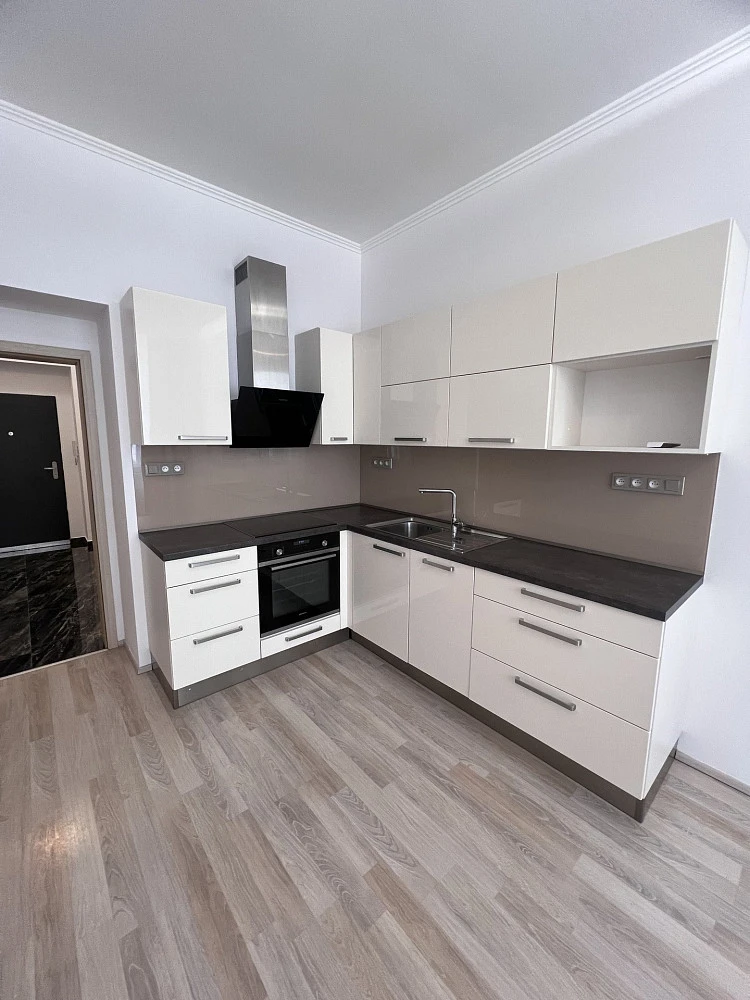 Součástí bytu je kuchyňská linka vybavena indukční varnou deskou, digestoří, troubou a myčkou nádobí. Vinylová podlaha a dlažba s vysokým leskem.