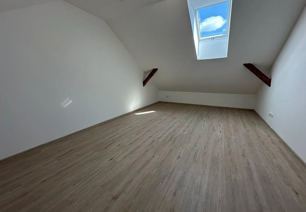 Za vchodovými dveřmi se ocitneme v prostorné chodbě (cca 7,02 m²), ze které je vstup do velké koupelny (cca 6,33 m²). Koupelna s WC je vybavena umyvadlovou skříňkou, umyvadlem, velkým zrcadlem, WC a sprchovým koutem. Hlavní dominantou bytu je hlavní pokoj s kuchyňským koutem (cca 35,32 m²), který disponuje novou kuchyňskou linkou, jejíž součástí je lednice s mrazákem, digestoř, elektrická trouba a elektrická sklo-keramická deska a s největší pravděpodobností bude sloužit jako obývací pokoj s jídelnou a kuchyní. V této místnosti je také široké točité schodiště vedoucí do mezonetu, kde nás přivítá prostorná galerie o výměře (cca 24,82 m²) a samostatný pokoj (cca 27,55 m²). V obou těchto místnostech je klimatizace značky LG, která chladí i vytápí. Jsou zde přiznané dřevěné trámy, díky kterým místnosti vypadají opravdu nádherně. V přízemí nesmíme opomenout další samostatný pokoj (cca 10,40 m²).