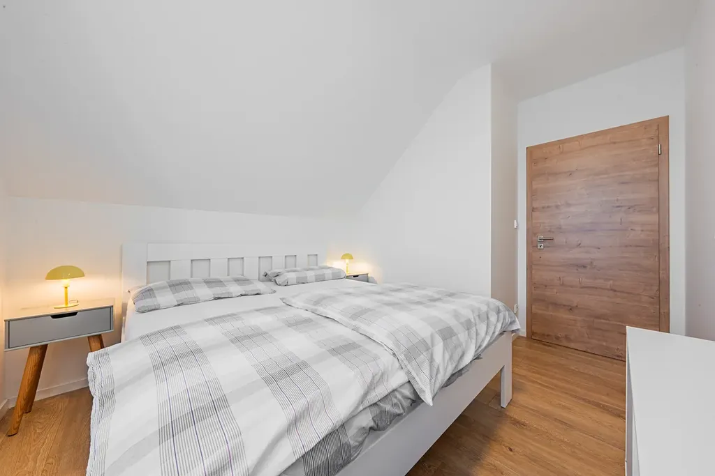 Dispozice domu je ideální pro větší rodinu. V přízemí se nachází zádveří, pracovna, obývací pokoj, kuchyň, chodba a toaleta. V patře jsou tři pokoje, technická místnost a dvě koupelny s toaletou. Pochozí půdní prostor slouží k uložení sezónních věcí. Z obývacího pokoje je přímý vstup na terasu a zahradu přes francouzské okno.