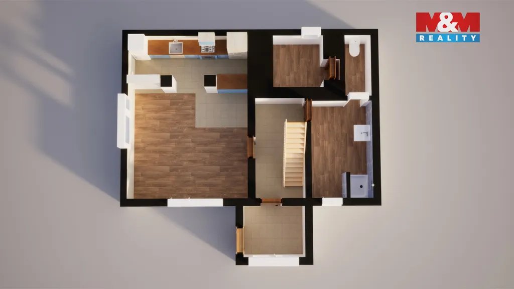v přízemí naleznete prostorné zádveří a chodbu, ze které vlevo vstupujete do velké místnosti, která slouží jako obývací pokoj, jídelna a kuchyně zároveň.