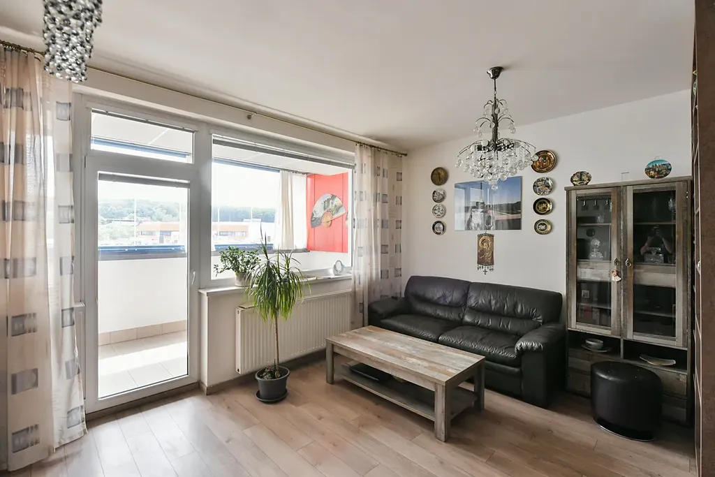 Dominantou bytu je prostorná zasklená lodžie s příjemným posezením, ideální pro relax. Koupelna je vybavena vanou, umyvadlem, WC a pračkou.