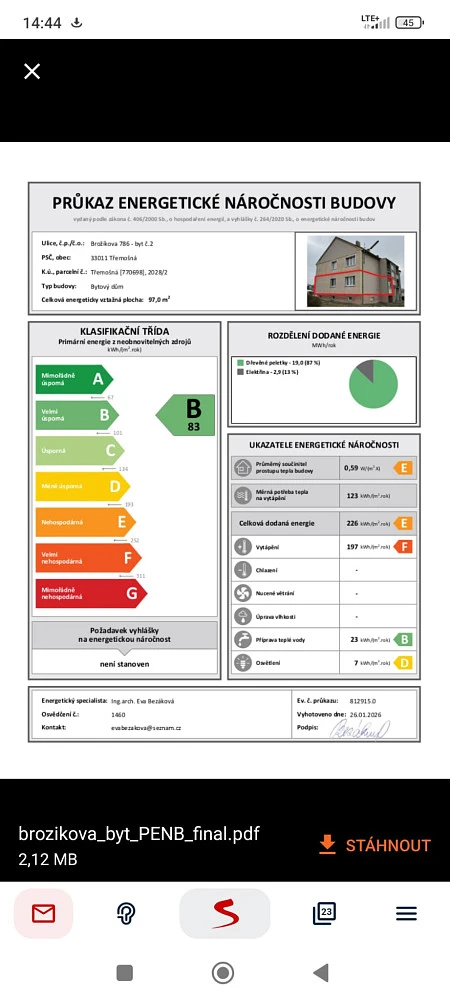 Nabízíme k prodeji byt ve zděném domu v Třemošné u Plzně o dispozici 3+1+b o užitné ploše 74 m² s uzavřeným balkonem. Byt se nachází v prvním nadzemním, zvýšeném podlaží. Již při vstupu do bytu na Vás dýchne úžasný prostor se samostatnými vstupy do místností. Do bytu je zavedena elektřina, odpad do společného septiku, veřejný vodovod. Ohřev vody zajišťuje boiler v koupelně. Vytápění zabezpečuje 3 roky provozovaný kotel na pelety s výměníkem, který je umístěný na prostorné vstupní chodbě s rozvodem do radiátorů. Dům a byt je částečně zateplený. Byt má energetickou náročnost třídy „B“. Roční vytápění finančně vyjde maximálně do 15000,- Kč. Prosvětlený byt zajišťují plastová okna. V domě jsou 4 bytové jednotky, bez fondu oprav. V blízké budoucnosti je počítáno s rekonstrukcí střechy. V zadní části pozemku je možno si pronajmout pozemek na zahrádku za cca 1000,-Kč za rok. K bytu jsou 2 sklepy ve výlučném užívání o celkové ploše 31 m². Hypotéku rádi a bez poplatků zařídíme. V Třemošné je veškerá občanská vybavenost, železniční i autobusová doprava. Dojezd do Plzně je cca 4 km. Doporučuji.