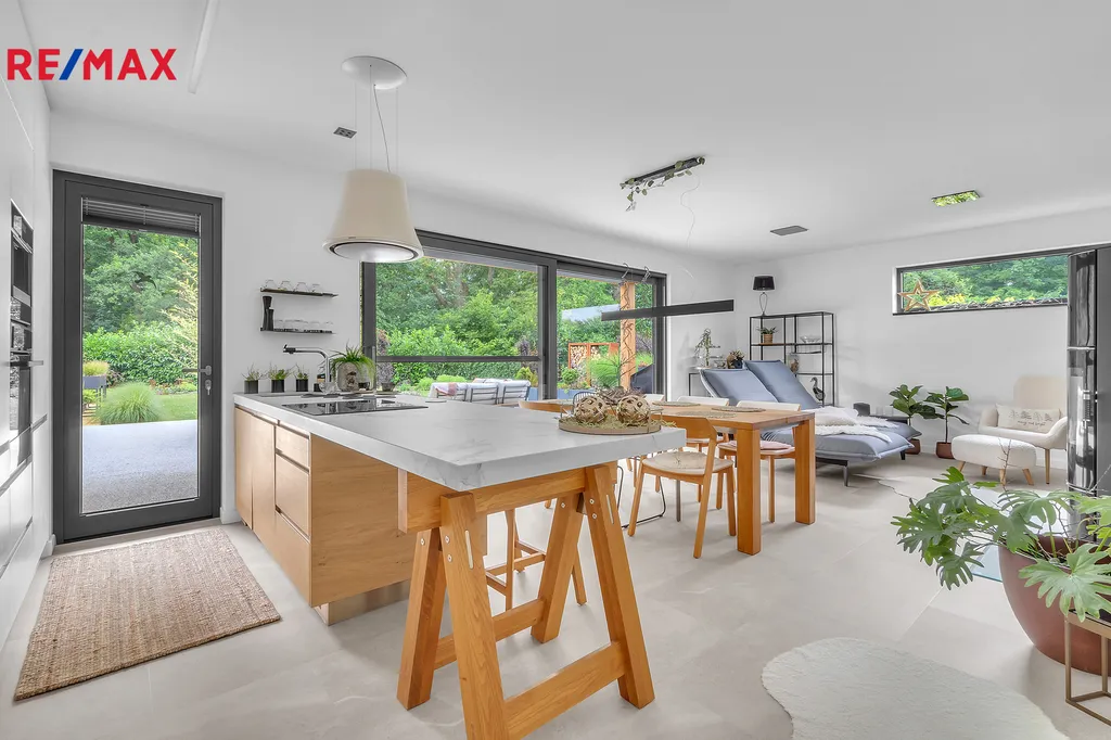 Vnitřní vybavení domu - zn. Kuchyně zn. SYKORA s pracovní deskou na míru z kamene Dekton 6cm se zapuštěným granitovým dřezem, spotřebiče Electrolux, AEG (parní trouba a vestavěný kávovar, myčka a lednice), designová digestoř ELICA. Krbová kamna STORCH VULSINI s přisáváním vzduchu, nerezový komín tříplášťový, el. regulace. Jídelní stůl masiv a židle zn. TON, dub. Značková osvětlovací tělesa INTRO LUCE na d.o.. Dveře zn. SAPELI elegant, bezfalcové provedení se značkovým kováním zn. TUPAI DEDOS. Na chodbě a v ložnici nábytek na míru zn. SYKORA. Koupelna SOLITÉR, HANSGROHE, PURAVIDA a ALESSI. Vypínače a zásuvky zn. ROON dotykové. Vnitřní parapety žulové. Podlahy jsou v kombinaci vinylu a dlažby.