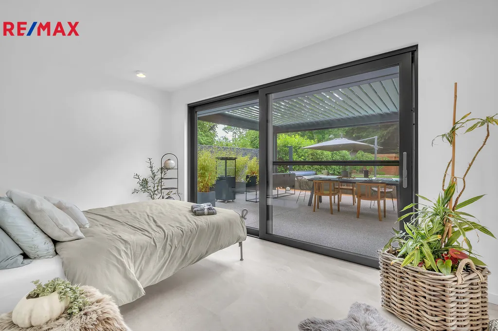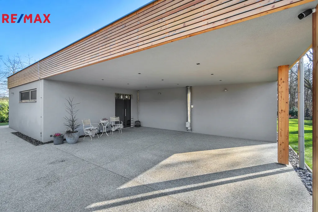 Venkovní vybavení domu – Bioklimatická hliníková pergola 24m2, s otočnými lamelami a ze všech stran opatřená dle potřeby el. roletami se senzory proti dešti a větru. Celoroční vířivka, protiproud, osvětlení, Canadian Spa zn. Mollus 10m2 s pískovou filtrací. Terasa TERAFEST premium, betony a kamenný koberec PIEDRA. Zahradní dřevěný domek 14m2 včetně regálového systému. Z poloviny pozemku oplocení GABION. Brána na el. pohon, videotelefon, 3x bezpečnostní kamera.