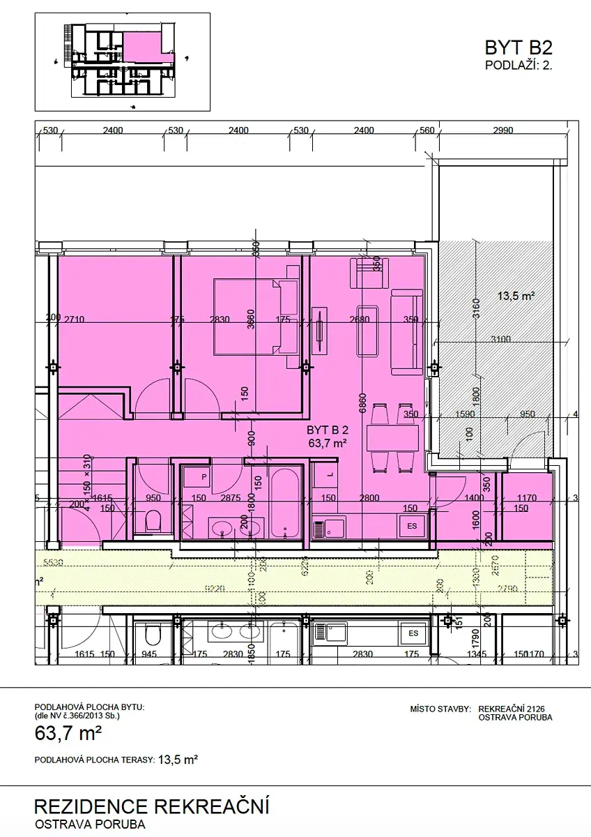 byt B2 o podlahové ploše (dle NV č.366/2013 Sb.) 63,7 m2 byt a 13,5 m2 terasa