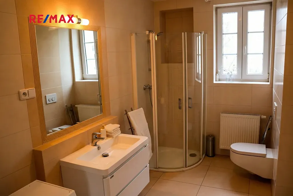 • Koupelna pro ranní rituály: Moderní sprchový kout, čistý design a vše potřebné včetně pračky.