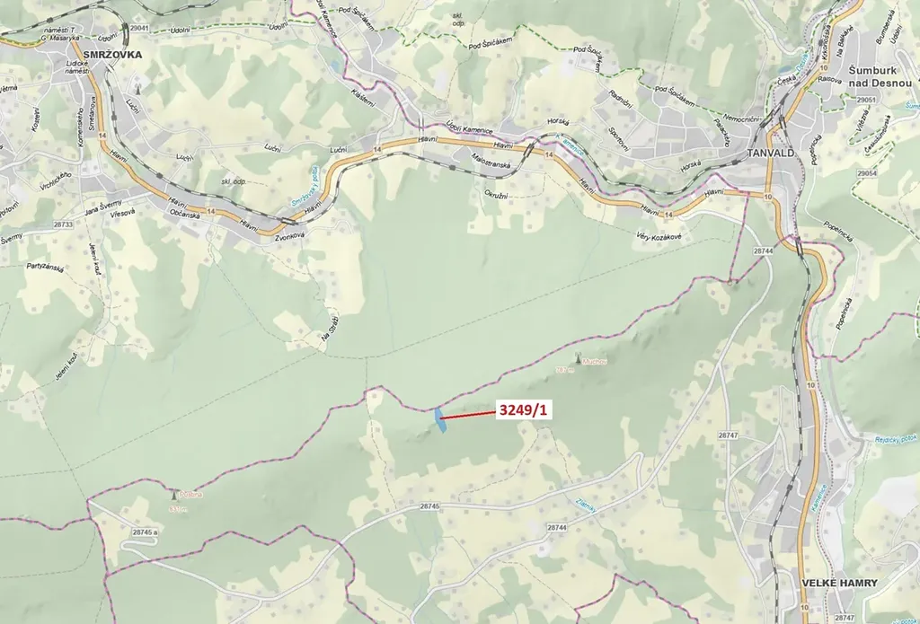 Lesní pozemek o výměře 5995 m2, parcelní číslo 3249/1, podíl 1/1, katastrální území Velké Hamry, obec Velké Hamry, obec s rozšířenou působností Tanvald, okres Jablonec nad Nisou, Liberecký kraj. Po těžbě.