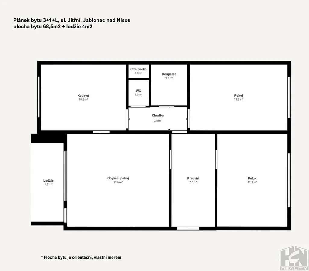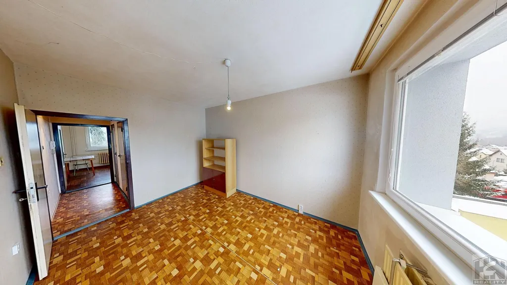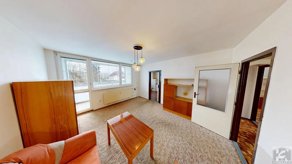 Dispozice bytu: předsíň (chodba), pokoj 12,3 m², pokoj 12 m², obývací pokoj 17,9 m², lodžie 4m² (jižní strana), kuchyň 10,4 m², chodba, koupelna, WC a příslušenství mimo byt - sklepní kóje. Provozní náklady 4.337,- Kč/měs. + elektřina.