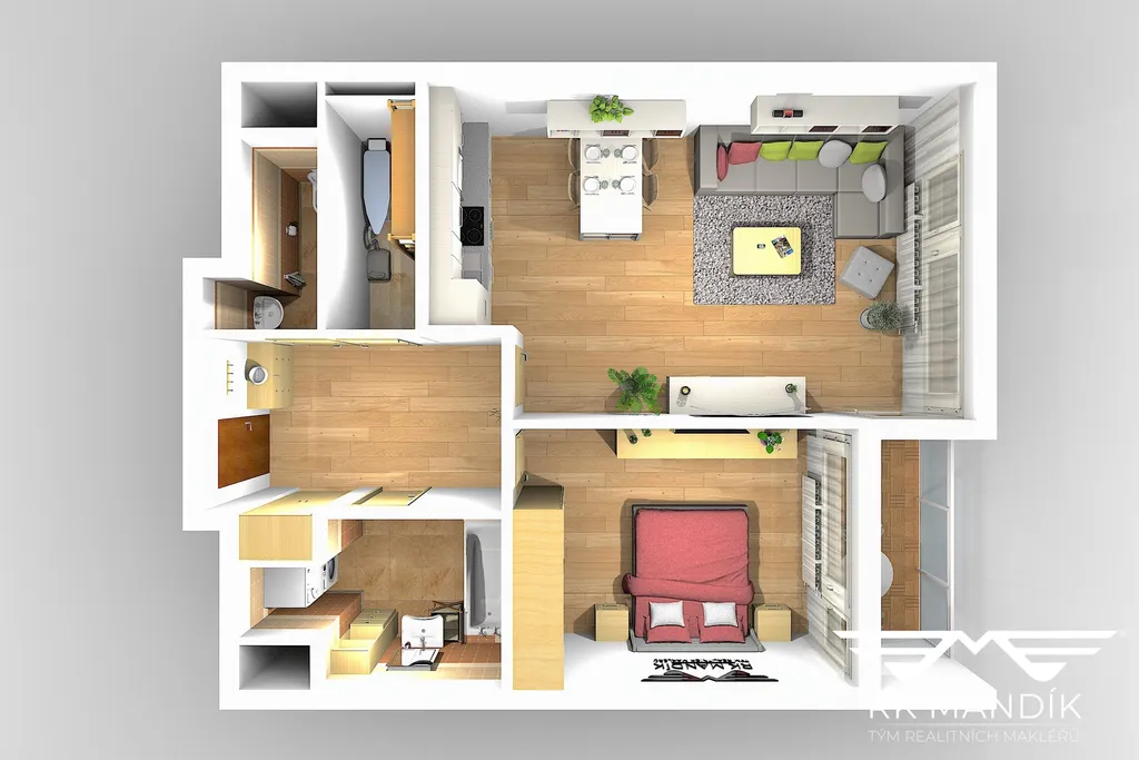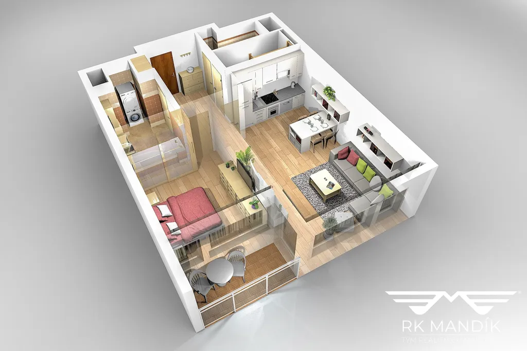 Dominantou bytu je prostorný obývací pokoj s kuchyňským koutem (27,41 m²) a přímým vstupem na lodžii (4,54 m²) ideální na ranní kávu. Kuchyňská linka je osazena spotřebiči: myčka, elektrická trouba, sklokeramická varná deska, digestoř, mikrovlnná trouba a lednice s mrazákem. Ložnice (14,14 m²) je samostatná s dostatkem prostoru na postel a šatní skříň.