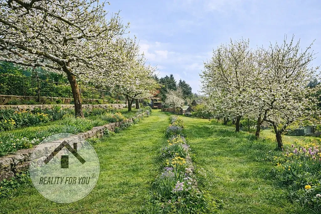 Na pozemku jsou vzrostlé stromy: různé druhy jabloní, ryngle, broskve, švestka, višeň a další.