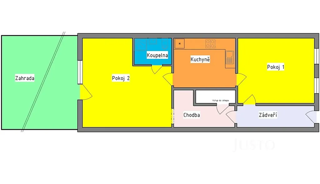 Součástí dispozice jsou dva pokoje, kuchyně, chodba, koupelna s WC, sklep a zahrada. Plocha zahrady činí cca 94 m².