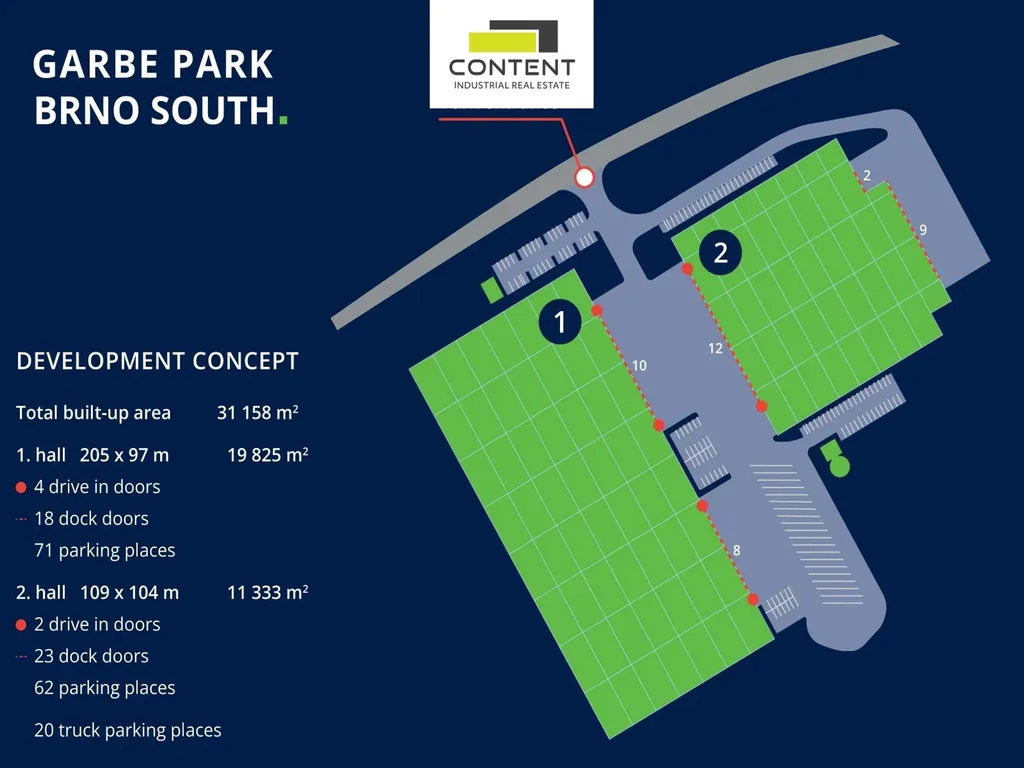 V zastoupení majitele a bez provize nabízíme novostavbu skladu nebo výrobních prostor o velikosti 19825 m², umístěných v moderním parku nacházejícím se podél dálnice D52, EXIT 23.