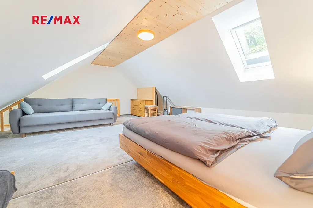 Do zvýšeného patra se jde po dřevěných schodech. Zde se vám poté otevře velký prostor (35 m2), který se dá rozdělit na dvě menší místnosti. Jsou tady dvě střešní okna se žaluziemi, manželská postel, gauč (válenda) a sófa. Celý byt je pokrytý moderní dlažbou, jen v horním patře je položený koberec, který celou místnost zatepluje a zútulňuje.