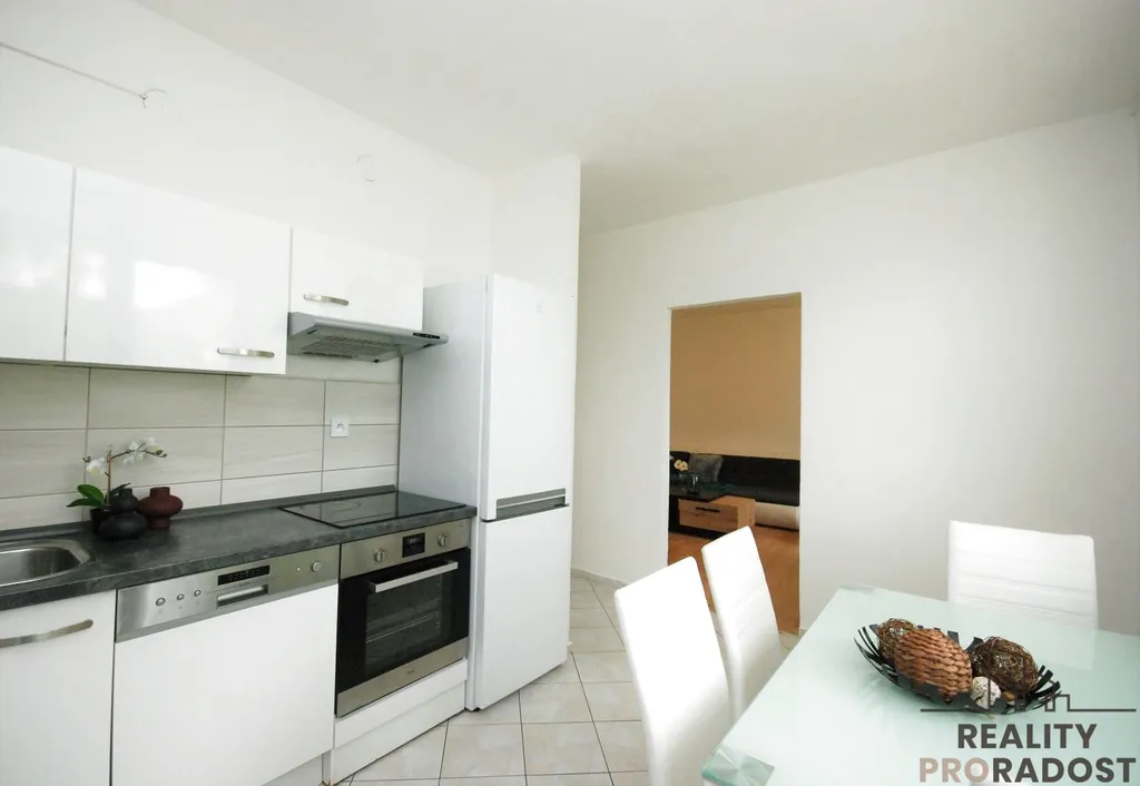 Dominantou kuchyně je bílá vestavná kuchyňská linka, která disponuje sklokeramickou varnou deskou, pečící troubou, myčkou, odsavačem par a lednicí. Je zde také prostor na jídelní stůl.