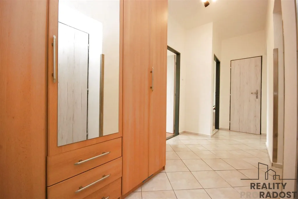 Dispozice bytu je velmi praktická. V chodbě najdeme dostatek místa na šatní skříň a vstup téměř do všech místnosti bytu, krom obývacího pokoje. Byt má dvě samostatné ložnice, koupelnu s umyvadlem, vanou a místem na pračku a samostatné WC. Z chodby je také dostupná šatna.