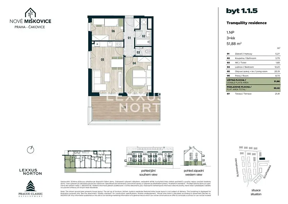 Byt je navržen s důrazem na funkčnost a efektivní využití prostoru. Přímý vstup na terasu z obytné části zajišťuje dostatek denního světla a příjemné propojení interiéru s venkovním prostorem.