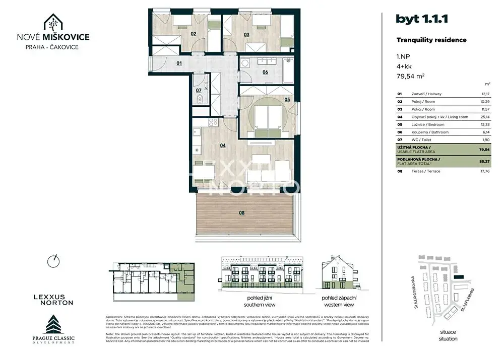 Nabízíme k prodeji promyšleně řešený byt 4+kk v rezidenčním projektu Nové Miškovice v Praze – Čakovicích. Byt disponuje užitnou plochou 79,54 m² a příjemnou terasou o velikosti 17,76 m², která přirozeně rozšiřuje obytný prostor a přináší možnost každodenního kontaktu s venkovním prostředím.