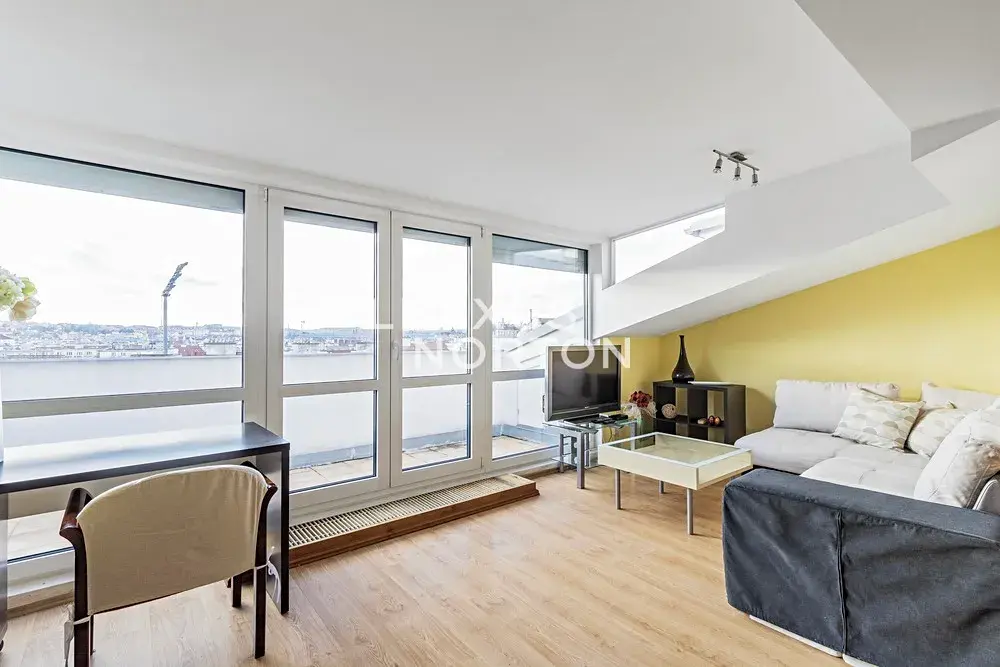 Tento světlý nezařízený byt k pronájmu nabízí k užívání vstupní chodbu, obývací pokoj s kuchyňským koutem, ložnici, koupelnu, samostatnou toaletu. K bytu náleží sklepní kóje a terasa s výhledem na Prahu.
