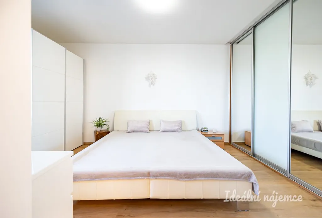 Na obývací pokoj navazuje ložnice vybavena velkou vestavnou šatní skříní, volně stojící skříní prostornou komodou a kompletní postelí.