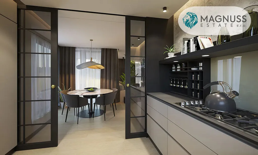 Velkoformátová okna propojují interiér s exteriérem a otevřený obývací prostor s kuchyní vytváří prostorné, světlé a vzdušné prostředí. Přímý vstup na terasu a zahradu nabízí ideální místo pro odpočinek, grilování či rodinná setkání pod širým nebem.