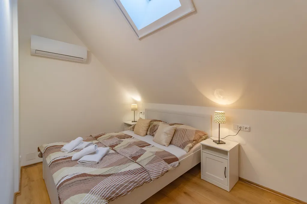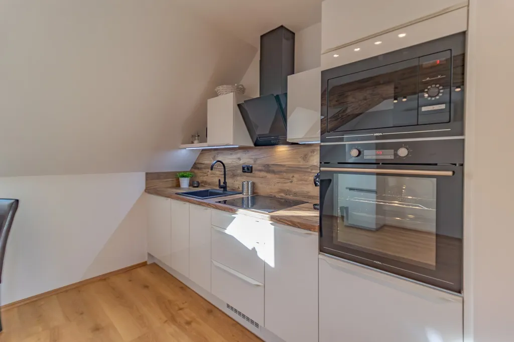 Apartmán č. 3. o čisté podlahové ploše 66,5 m2 je kompletně moderně a vkusně vybavený jak elektrospotřebiči, tak nábytkem. Vnitřní dispozice 3+kk v 1. NP: vstupní předsíň, kuchyňský kout - kuchyňská linka zn. Oresi ( s el. horkovzdušnou troubou s indukční deskou, mikrovlnnou troubou, lednicí s mrazákem zn. Mora). Jídelní koutek s obývacím prostorem včetně nábytku a TV ; dvě ložnice. Koupelna (se sprchovým koutem, umyvadlem, topným žebříkem a připojením k pračce, baterie – Grohe, sanita - Geberit), samostatné WC. V rámci rekonstrukce bylo provedeno zaizolování stropů, položeny protihlukové podlahy, plovoucí podlaha zn. Quick – Step a protihlukové stěny mezi apartmány, okna dřevěná s trojskly. Vytápění je řešeno klimatizací Haier - ovládanou tel., vjezdová brána ovládaná tel. a kódovým systémem, samostatné připojení wifi, kamerový systém. K bytu náleží vlastní venkovní prostor k posezením, kój (5m2), jedno parkovací stání u domu a společné venkovní prostory k odpočinku. Voda čerpána z vrtané studny, odpad řešen ČOV. V rezidenci je dále k dispozici využití sauny a fitness.