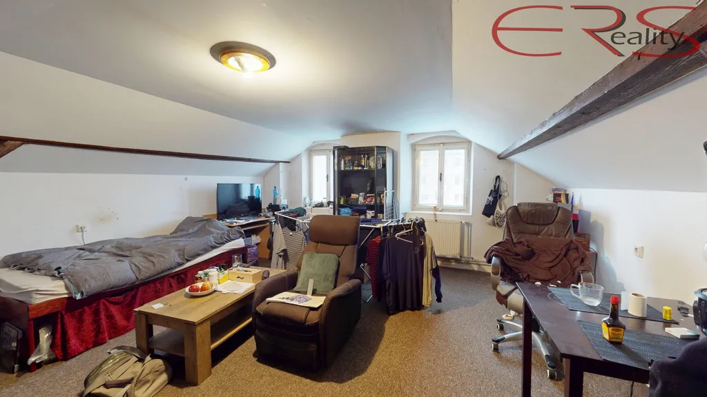 podkroví tvoří dvě bytové jednotky. Podkroví má atmosféru „dům s duší“ potvrzenou i realitou: šikminy, přiznané trámy, okna do náměstí… a ano, momentálně i běžný provoz života (čti: žádná katalogová sterilita, ale reálný stav).