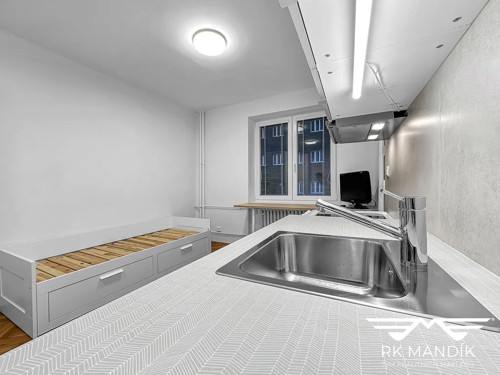 V bezpečném bytovém domě se nachází od 1. 3. 2026 dostupná garsonka včetně příslušenství (22,1m²). Byt je dispozičně řešen pokojem (16,2m²) s úložným prostorem, novou postelí, pracovním prostorem, kuchyňskou linkou včetně spotřebičů (kombinovaný sporák s elektrickou troubou a myčkou, digestoř), dále pak koupelnou (2,1m²) se sprchovým koutem a pračkou, samostatným WC (0,9m²) a chodbou (1m²). Součástí pronájmu je zděný sklepní prostor (1,9m²).