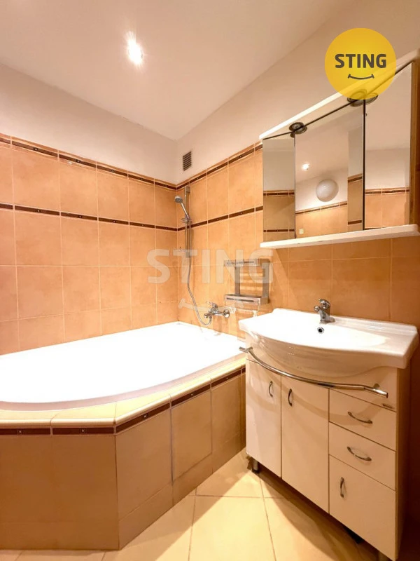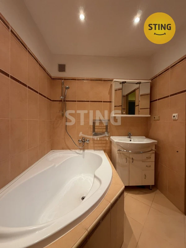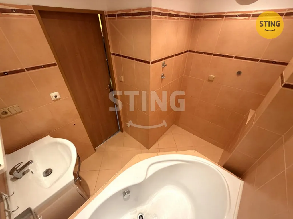 Koupelna je prostorná, vybavená rohovou vanou a místem pro pračku i sušičku, WC je samostatné. Výhodou bytu je lodžie a výhled na dvě světové strany.