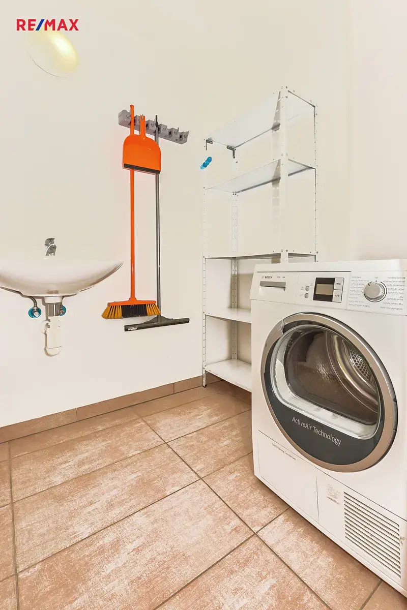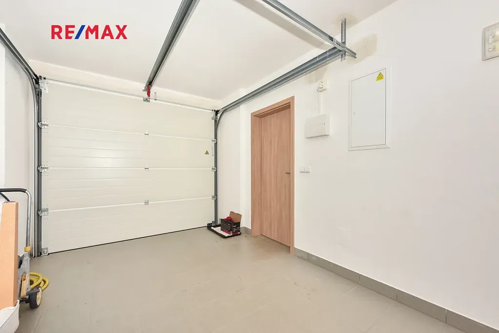 V přízemí domu se nachází prostorný obývací pokoj s kuchyňským koutem a moderní kuchyňskou linkou s vestavěnými spotřebiči, dále toaleta s umyvadlem, šatna, prádelna a garáž pro jeden osobní automobil. V patře jsou k dispozici čtyři pokoje, šatna a koupelna s vanou a toaletou. Šatna v přízemí a šatna v patře jsou vybaveny vestavěnými skříněmi, stejně jako dva pokoje v patře. Jeden z pokojů v patře lze využívat také jako pracovnu, je zde k dispozici knihovna. V obývacím pokoji je rozkládací sedací souprava a nábytková obývací stěna. Majitel domu neuvažuje o demontáži stávajícího vestavěného nábytku na míru.