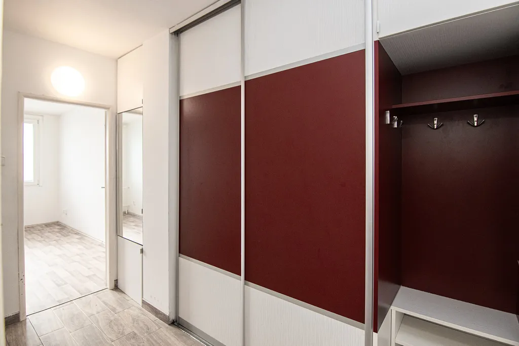 V chodbě je prostorná šatní skříň s věšákem a botníkem.