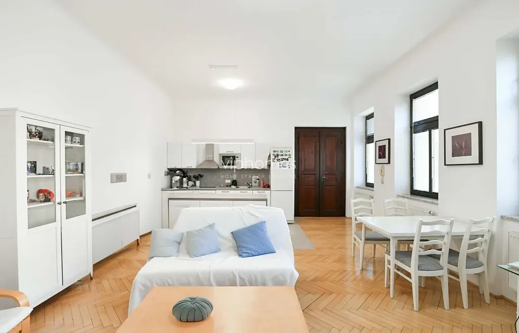 Komfortně zařízený byt situovaný ve 4. NP kompletně zrekonstruované budovy z konce 19. století. Nový výtah a k dispozici bezpečné parkování v domě. Rezidenční budova je vzdálena jen pár minut chůze od Václavského náměstí. Veškerá občanská vybavenost, stanice metra Můstek a Muzeum, trasa A a C.