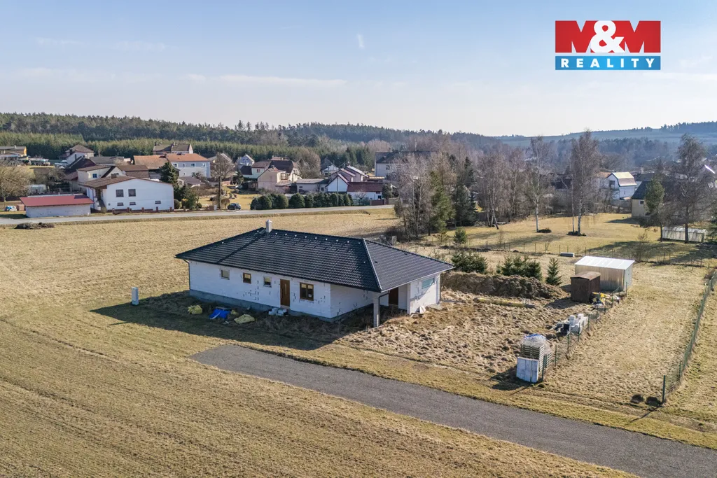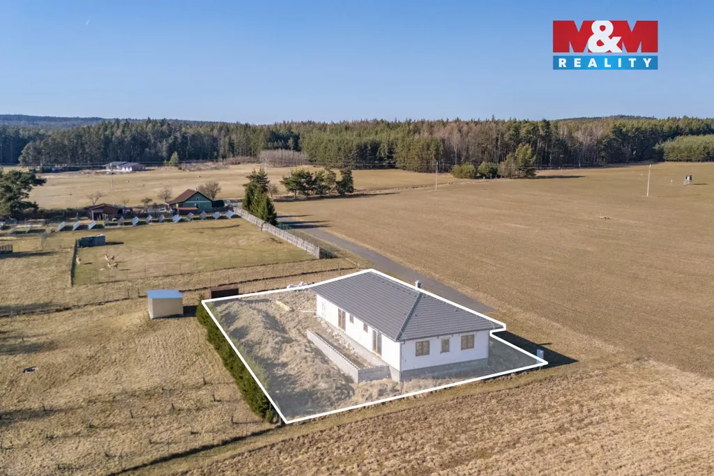 Nabízíme k prodeji rodinný dům ve výstavbě, situovaný v klidné části obce s dostatkem soukromí a krásnou okolní přírodou. Jednopodlažní dům je navržen pro pohodlné rodinné bydlení a nabízí užitnou plochu 120 m², celkem 6 místností a prostornou terasu o velikosti 43 m². Dům stojí na pozemku o rozloze 1001 m² a je v osobním vlastnictví, výstavba započala v roce 2018. Nemovitost je připravena na vlastní vrtanou studnu, domácí ČOV s akumulací vyčištěné vody a vsakem na pozemku. Elektřina je již přivedena, elektrický pilíř se nachází na hranici pozemku. Vytápění je navržené podlahovým topením v kombinaci s krbovými kamny, ohřev vody zajišťuje bojler. Parkování je možné přímo na pozemku, příjezd po zpevněné obecní komunikaci. Lokalita je ideální pro klidné bydlení i aktivní životní styl – cykloturistika, jízda na koni a pobyt v přírodě, autobusové spojení v dosahu. Pokud hledáte dům, kde si interiér vytvoříte podle sebe tak toto je ideální volba. Pro více informací kontaktujte makléře!