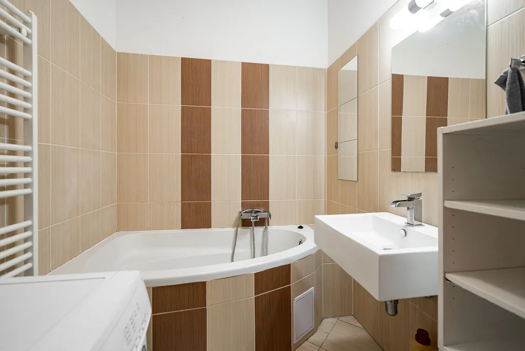 Prostorná kuchyň disponuje linkou s varnou deskou, elektrickou troubou, digestoří, myčkou, mikrovlnnou troubou a lednicí s mrazákem. Koupelna je vybavena vanou a umyvadlem, toaleta se nachází v samostatné místnosti, což přispívá k většímu komfortu. Ohřev vody a vytápění zajišťuje plynový kotel.