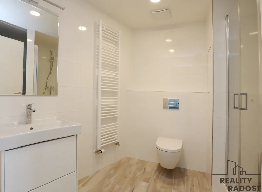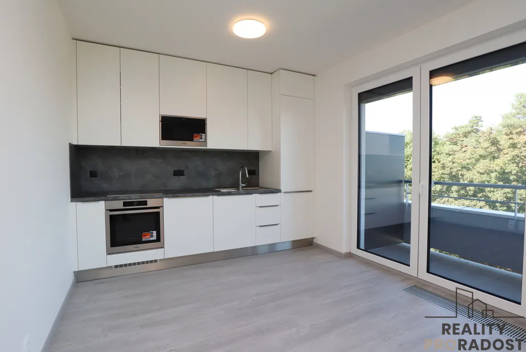 Moderní kuchyňská linka je vybavena elektrickou troubou, varnou deskou, lednicí s mrazákem, myčkou a mikrovlnkou. Kuchyně poskytuje dostatek úložného a pracovního prostoru. Z pokoje se vchází na balkon, který je orientovaný na severozápadní stranu, do zeleně. Velká okna v bytě poskytují dostatek světla a hezký výhled do otevřeného prostoru. Podlahy jsou vinylové, v bytě je podlahové topení. Na oknech jsou předokení žaluzije na dálkové ovládání.